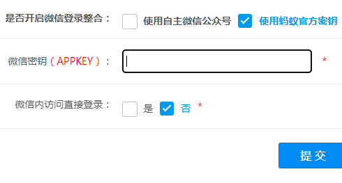 將密鑰粘貼在螞蟻CMS(網站后臺)-》接口-》登錄接口-》微信登錄整合-》是否開啟微信登錄整合-》選擇使用螞蟻官方密鑰即可(V6.9+支持)。