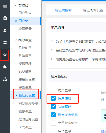 如果您的站點(diǎn)未在注冊(cè)頁(yè)面開(kāi)啟驗(yàn)證碼的話,有可能會(huì)造成短信無(wú)法正常發(fā)送,因此需要您在后臺(tái)-》系統(tǒng)-》核心設(shè)置-》驗(yàn)證碼設(shè)置-》用戶注冊(cè)-》啟用驗(yàn)證碼-》提交。