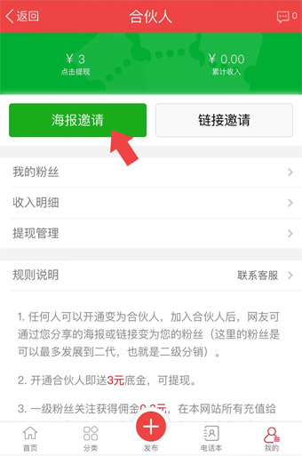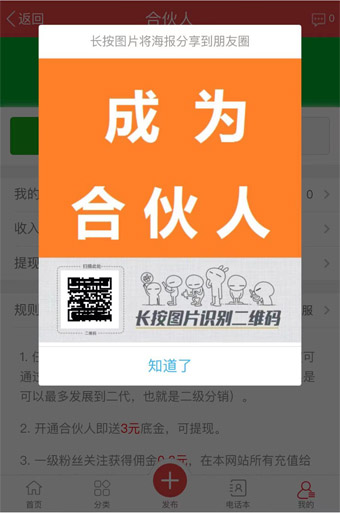 2,好友掃碼(長按識別二維碼)關(guān)注后,會成為你的粉絲。每個關(guān)注得傭金0.3元,粉絲在網(wǎng)站上的消費也有30%的傭金,如:粉絲購買了一個月的置頂,費用100元,你得到傭金30元