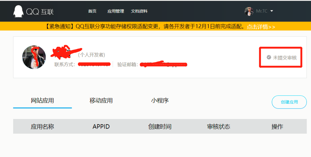 部分螞蟻用戶在配置QQ登錄時,出現(xiàn)賬號未提交審核,無法配置QQ回調域名的情況。